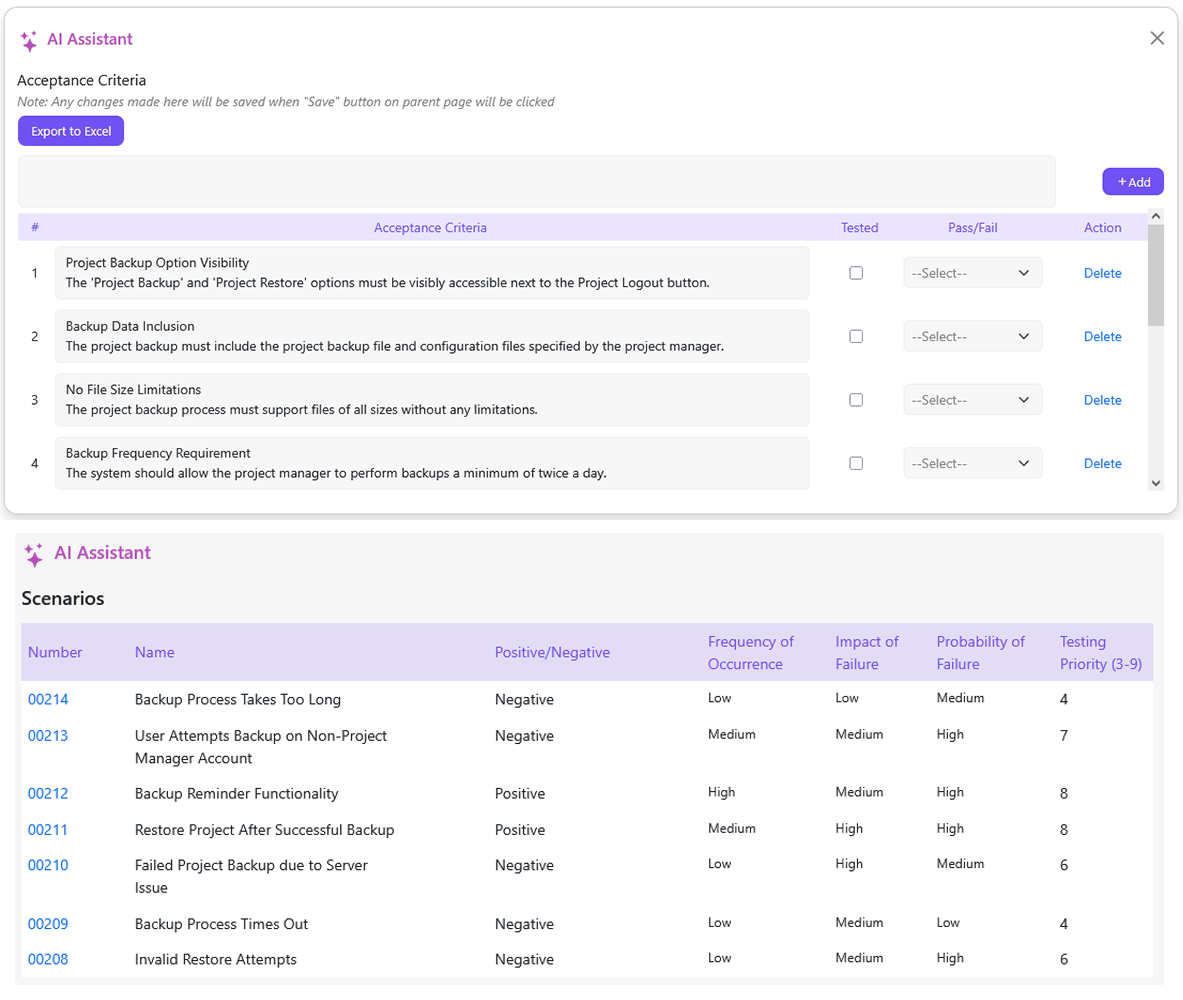 AI assists will generate real-life scenarios and acceptance criteria that cover every aspect of the user story and/or requirement. Scenarios will have enough details to help generate test cases and establish testing priorities.