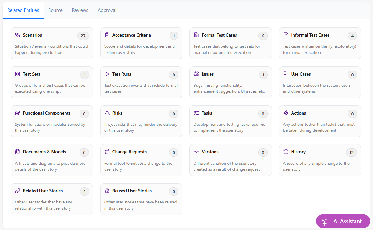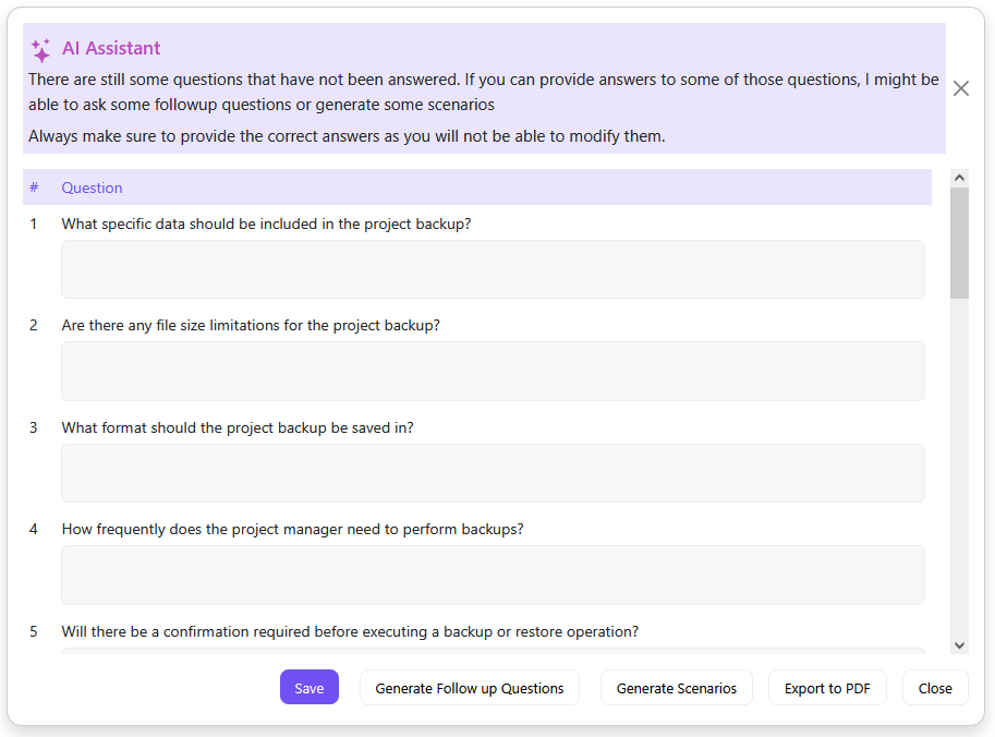 Get it Free Now Request a DemoOur AI assistant will generate intelligent and comprehensive questions to uncover hidden details of the user story and/or requirement. Based on your answers, the AI assistant will also generate a number of follow up questions.